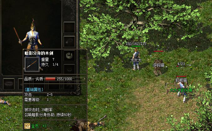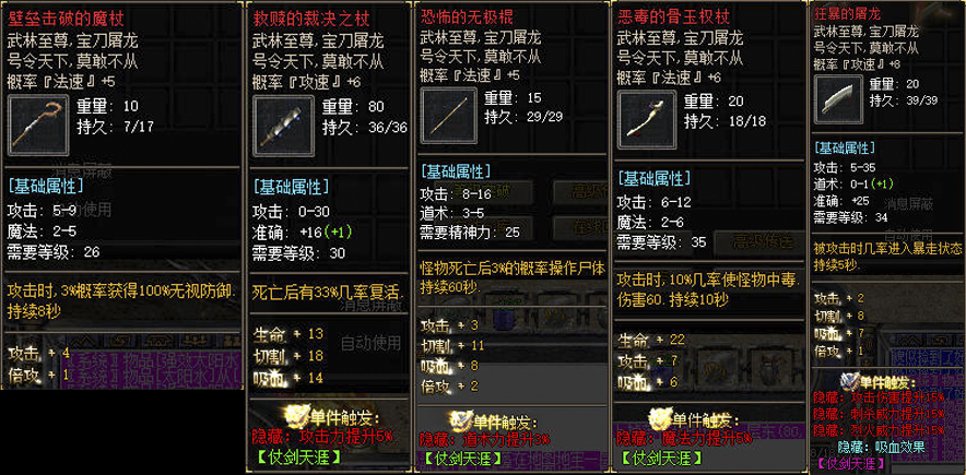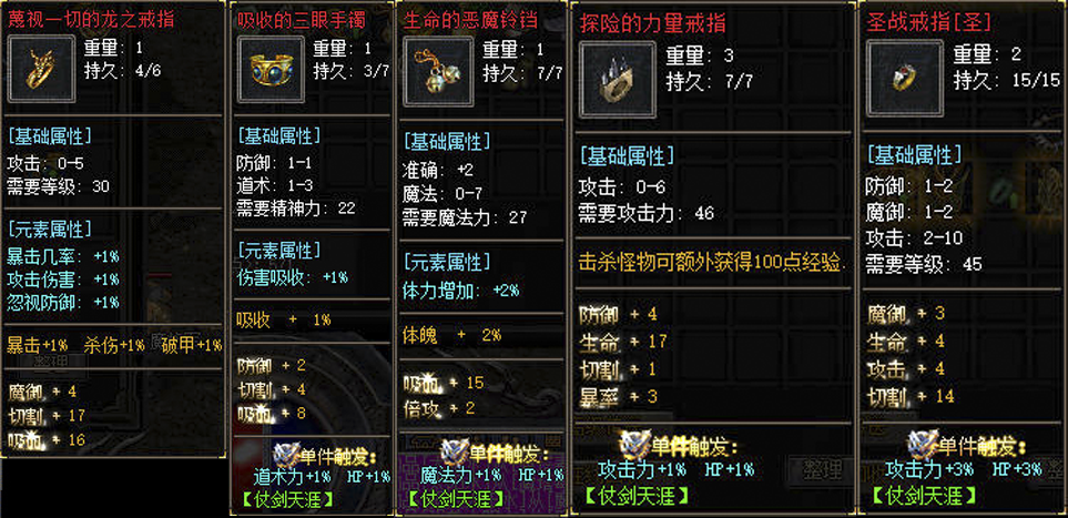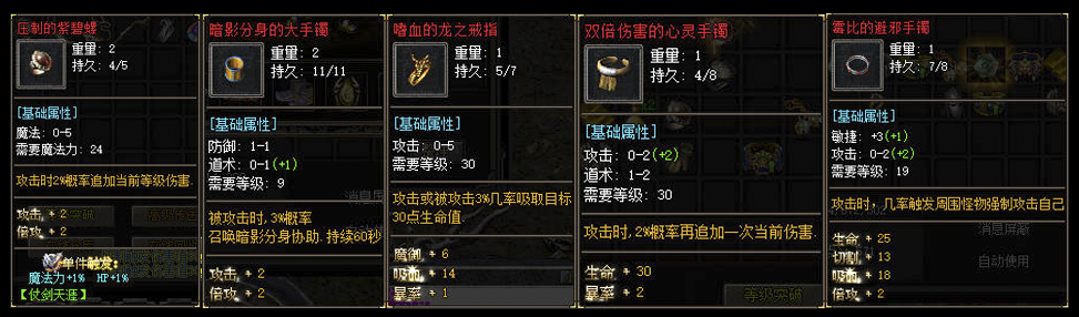 拾取鉴定:随机附加攻魔道、HP、MP、防御、吸血、切割、倍攻、爆率等暗黑属性。